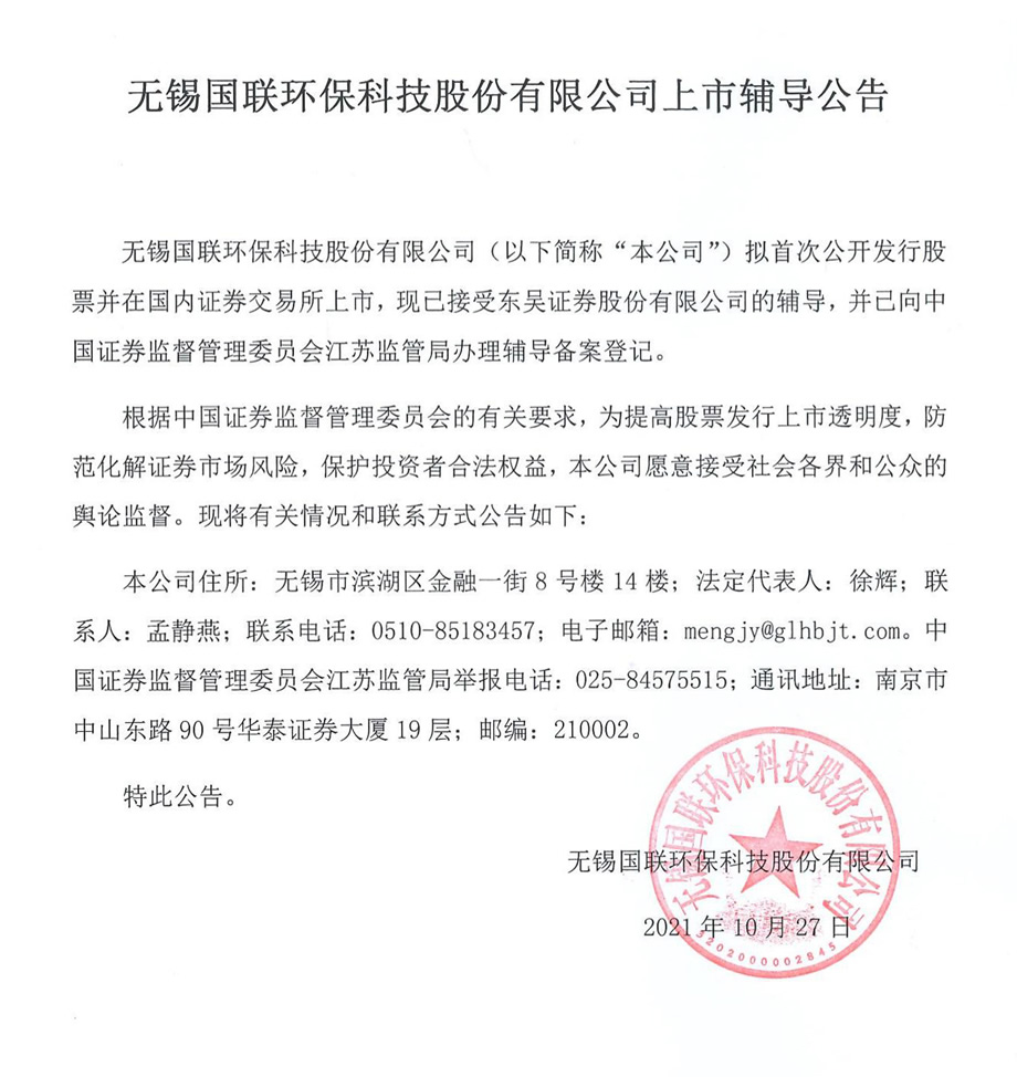 無錫國聯(lián)環(huán)保科技股份有限公司成立于2011年1月27日,是一家以污泥減量化、無害化、資源化處置為產業(yè)化發(fā)展的國有控股企業(yè),股本為109,470,852元。
